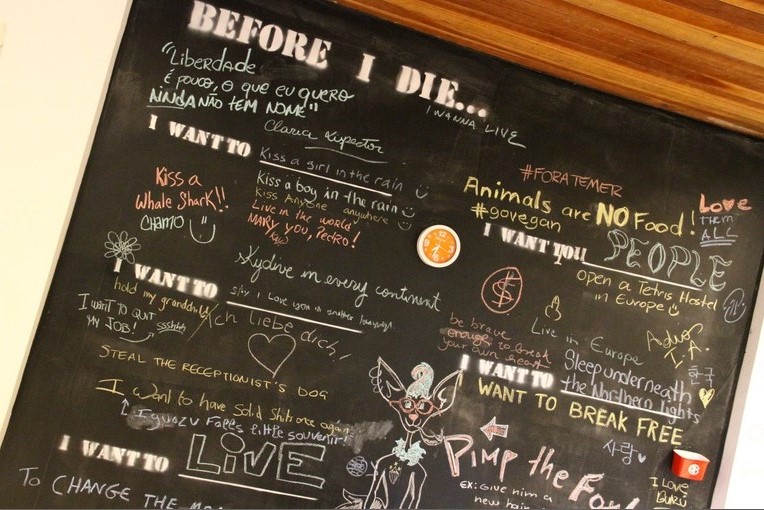 Outra coisa que eu amei foi a cozinha. Ela é cheia de mensagens, tem uma mesa grande pra ser compartilhada, tudo muito simples mas ao mesmo tempo increvelmente aconchegante. O painel convidando os hóspedes a deixar mensagens é simplesmente o máximo ! Tem ainda um cantinho com jogos e opções de leitura (adorei !). A cozinha é equipada e você pode usar a vontade. O café da manhã é servido das 8 da manhã até as 10 da manhã. Foi a única crítica maior que tive pois o café é servido muito tarde e mesmo assim no dia que fiquei lá, quando chegou 8 horas o café ainda não estava de todo pronto … ainda levou um tempinho pra ficar tudo disponível e claro que isso pode ser um ponto negativo pra quem quer partir cedinho pros passeios. Muitos passeios não começam muito cedo mesmo (como Cataratas, Parque das Aves, Dreamland, etc) mas pra quem quer por exemplo zarpar cedo pro Paraguai, aí já complica um pouco. Ai o jeito é se virar por conta na cozinha mesmo e preparar seu próprio café. Mas sinceramente ? Isso é um pequeno detalhe perto de tantas coisas boas que o hostel tem.