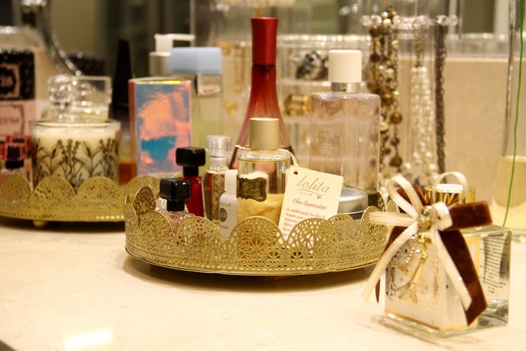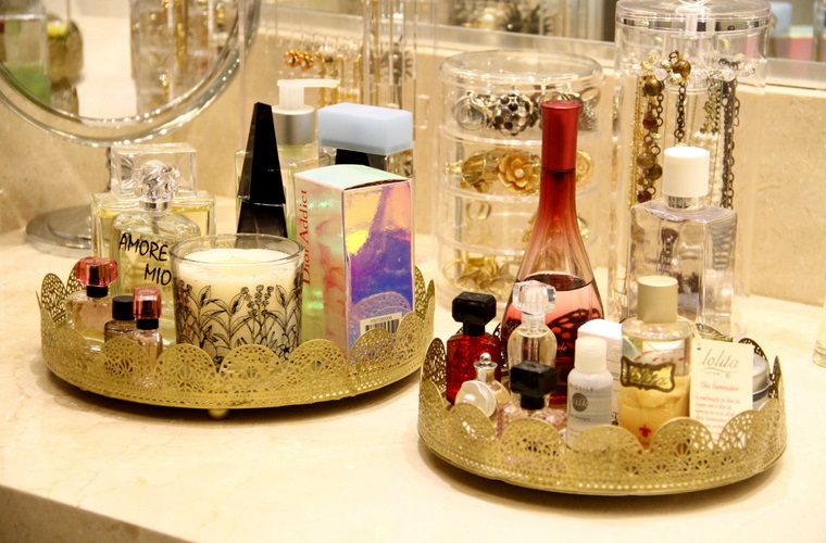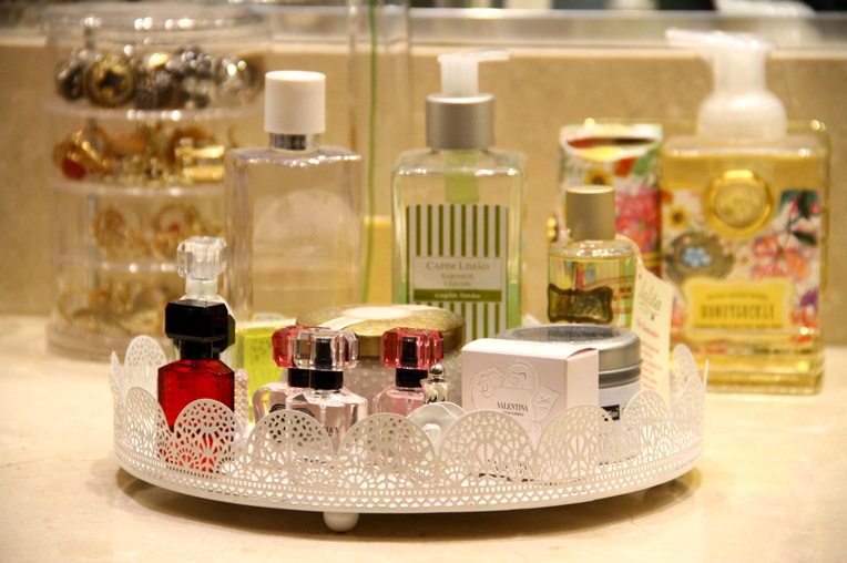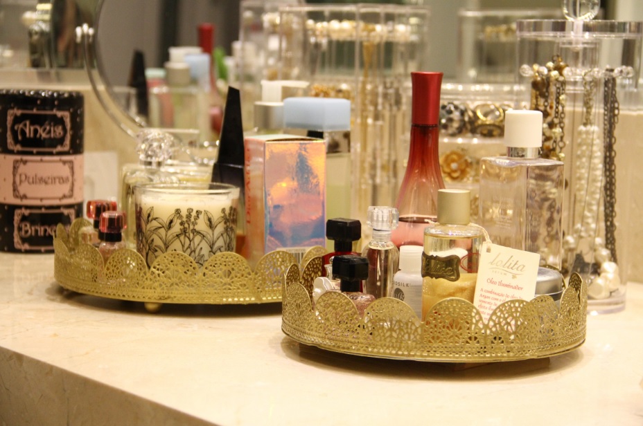 Pesquisei bandejas para perfumes em diversos lugares na internet e encontrei coisas muito lindas e encantadoras. De cores variadas, românticas, chics, moderninhas, de visual clean, espelhadas, com detalhes em inox, em madeira e pérolas … opções não faltam. O que achei falta foram de peças bonitas que se encaixassem num orçamento apertado.
